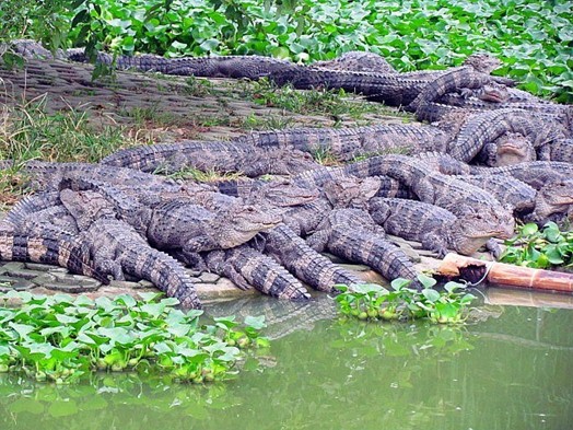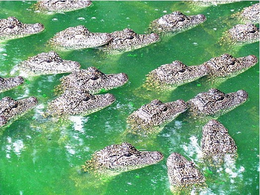 在這個生態園區,繁殖的揚子鱷按照年齡都進行分區養殖,“它們成群漂浮在水面上太正常了,揚子鱷是冷血動物,鱷魚探頭出來的主要目的是曬太陽的,夏天太陽和雷雨頻繁更替,一出太陽,鱷魚就會爬到岸邊,而在水中的鱷魚則伸頭仰脖子出來,直到太陽落山。而下雷雨的時候,鱷魚就縮進水池里。每天如此,都好幾年了。”這位負責人表示,目前園區共養殖鱷魚5000多條,眼下正是集中繁殖期,具體到年底會繁殖多少條,目前還不清楚,現在養殖的鱷魚中最長的也不過2米長。一位飼養員說,揚子鱷認得自己的窩,不管白天爬多遠,晚上都要回洞來,而且只會進自己的洞,不會爬到別人家里。不搶食、不搶窩,這種“紳士風度”可能是揚子鱷能和平共處的原因之一。
