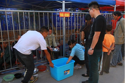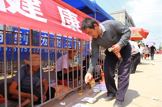 昨日,西山鎮政府工作人員稱,因廟會游客多,為避免發生踩踏事故,所以將乞討者用鐵柵欄圈了起來。