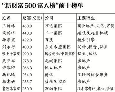 中新網(wǎng)訊 中國民生銀行私人銀行、《新財富》昨天聯(lián)合發(fā)布2012“新財富500富人榜”,萬達(dá)集團(tuán)的王健林以460億元的財富成為榜單首富,三一集團(tuán)梁穩(wěn)根、百度李彥宏二人分別以440億元和422億元的財富緊隨其后。