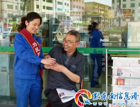 圖為黃平興大街加油站員工正在熱情為便利店玻璃墻前休息看報的顧客遞送茶水。(吳遠威)