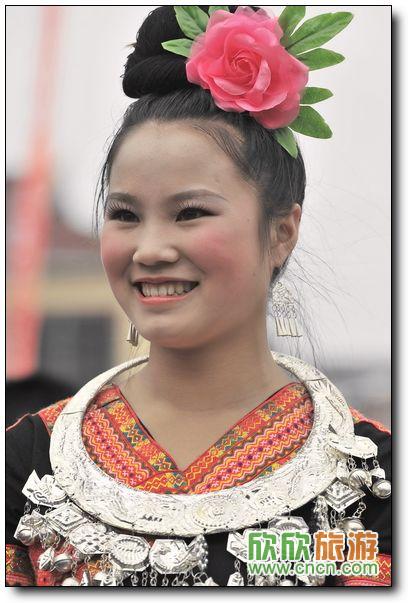 女孩頭上戴的大花好惹眼。常言說:好花也要綠葉扶。這為苗族姑娘好像在說:靚女更要好花扶。