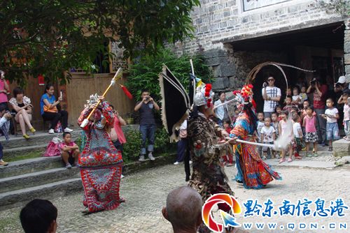 隆里古城漢戲班子老演員姚文星不顧年近八旬高齡克服炎熱天氣與漢戲班子成員登臺主演《三氣周瑜》精彩片斷,鑼鼓一響,表演中舞、跳、騰、躍幾乎是一氣喝成,唱腔渾厚有力、高亢激越,演技完美,贏來了采風團和觀眾的熱烈掌聲。