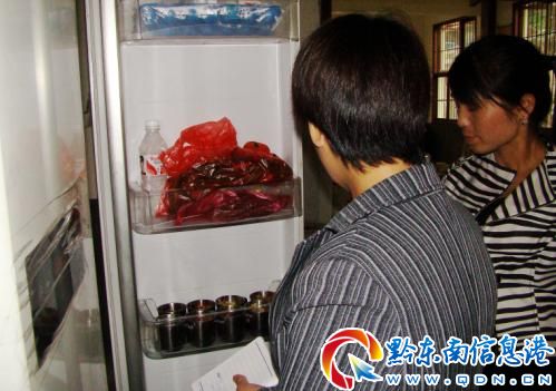 圖為9月13日,該縣教育局檢查小組正在鐘靈小學食堂檢查學生飯菜的留樣情況