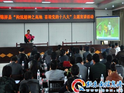 為喜迎黨的十八大勝利召開,營造濃厚的社會氛圍,激發廣大黨員、干部職工干事創業的信心和決心,錦屏縣委組建宣講報告團,到各鄉鎮和縣直機關舉辦宣講報告會,宣講內容對國發2號文件和“構建精神高地、沖出經濟洼地”的精神實質作進一步宣傳和解讀,同時由在創先爭優活動中涌現出來的先進典型的代表作先進事跡報告。圖為11月1日,全國勞動模范、全省2010—2012創先爭優優秀黨員、錦屏縣郵政局啟蒙支局鄉郵員張林昌在錦屏經濟開發區為當地干部群眾作先進事跡報告。(石源杰 楊秀廷)