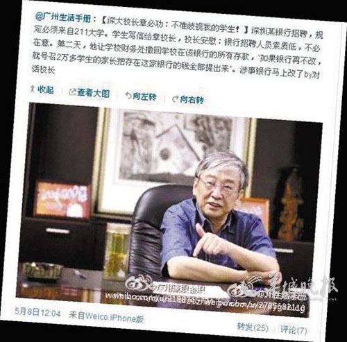 “深圳某銀行招聘,規(guī)定須來(lái)自211大學(xué)。學(xué)生寫(xiě)信給章校長(zhǎng),校長(zhǎng)安慰:銀行招聘人員素質(zhì)低,不必在意。第二天他讓學(xué)校財(cái)務(wù)處撤回學(xué)校在該銀行的所有存款,‘若再不改,就號(hào)召2萬(wàn)多學(xué)生的家長(zhǎng)把存在這家銀行的錢(qián)全部提出來(lái)’。涉事銀行很快改了招聘啟事。”引發(fā)網(wǎng)絡(luò)瘋傳,就是這條微博發(fā)出的內(nèi)容。