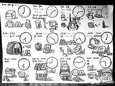 李女士是美院畢業(yè),因此有不錯(cuò)的繪畫功底,她選取了女兒一天作息時(shí)間來繪制。如早晨7點(diǎn)起床,有時(shí)鐘指示,還有杯子衣服和小馬桶等畫面,10分鐘刷牙洗臉,10分鐘吃早餐……每一個(gè)作息項(xiàng)目,她都細(xì)心地繪制了女兒熟悉的場景,如臺燈、書包、電視機(jī)等……每一個(gè)旁邊都有一個(gè)手繪的時(shí)鐘指示時(shí)間。