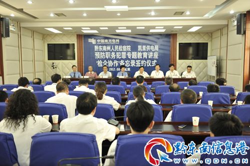 黔東南州人民檢察院副檢察長吳春英、徐承慶、紀檢組長劉建新,凱里供電局副局長張黔平、紀委書記、工會主席嚴阿冬、副局長魯周勛、總會計師李芳旺等領導出席簽約儀式,凱里供電局各部門中干部、重要崗位同志聆聽專題講座。