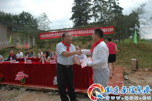 日前,由中國正安集團有限公司董事長楊昊龍先生捐資80萬元,為黎平縣佳所侗寨200名留守兒童新建的校舍正式開工。圖為黔東南州人大副主任、中共黎平縣委書記楊俊(左一)向楊昊龍先生(右一)頒發榮譽校長證書的情形。(陸書明 攝影報道)