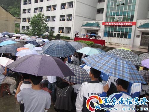 副校長龍軍宣布畢業生名單。雷山民族中學2012屆有673名學生,559名學生學業會考合格、德智體考核合格,光榮高中畢業,畢業率83.1%;另有54人順利高中結業。龍副校長說,今天的這場雨,為我們洗去了近日高考備戰的疲憊和塵埃,提醒著我們振奮精神,迎戰高考。