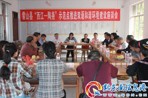 為推動雙語和諧發展,促進民族團結進步,宣傳“雙語和諧”的理念,探討雙語和諧環境建設的具體操作,切實把雷山縣“西江—陶堯”苗漢雙語和諧環境建設示范點建設為省級示范點。6月20日上午,全省雙語和諧環境建設示范點掛牌儀式暨座談會在雷山西江舉行。雷山縣委宣傳部、民族局、文體廣電局、旅游局、教育和科技局、相關鄉鎮政府領導和公務員代表、基層雙語學校領導及教師代表參加了掛牌儀式,并在西江小學舉行雷山縣“西江—陶堯”示范點推進雙語和諧環境建設座談會。