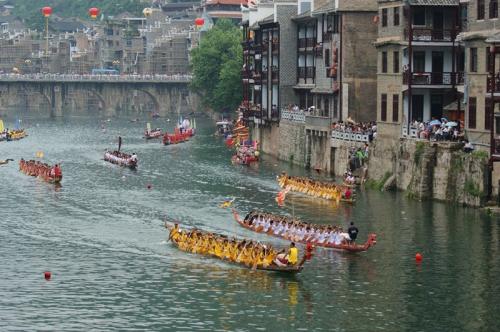 一年一度的端午節,早已經成為鎮遠人民全名狂歡的節日。鎮遠人民把歷史流傳下下來的習俗發揚光大,加入了許多現代人的審美和想法。清早,在青龍洞山門舉行祭龍儀式過后,運動員將標志性巨大龍頭護送下山門。正式比賽前還會有各種隆重而熱烈的游行儀式,為比賽增添喜慶氣氛。比賽前,兩支龍頭指揮用腳蹬在對方船頭,聽令一聲吼:“起!”雙方將并在一起的船蹬開,而宣布比賽開始。號子聲與急促的鑼鼓聲和岸上人吼聲如交響一片,悠遠而漫長。這樣的龍舟賽會從早上一直連續比賽到下午,之后,人們又進入端午節的狂歡之夜,各鄉村趕來的民族文藝表演隊與城關各文藝隊舉行端午龍舟節大聯歡。各種各樣的民俗儀式,原生態的歌舞表演,會伴著鎮遠深邃的夜景,將歷史傳統和現代生活演繹的淋漓盡致。