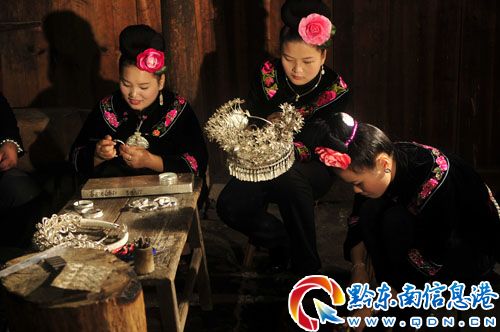 9月以來,雷山縣西江鎮麻料銀匠村的李光雄一家10人都在忙著加工銀飾品,以迎接國慶節的到來。李光雄一家為銀匠世家,祖祖輩輩都靠打制銀飾為生,如今他的3個弟弟及他2個兒子、弟媳兒媳們組成10人團打制傳統銀飾。目前在西江千戶苗寨開有6個銀飾鋪,僅在國慶節的第一天6個銀飾鋪的純收入就達3萬多元。圖為李光雄一家正在加工銀飾品的場面。(李雪)