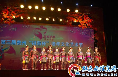 為豐富廣大老年人的精神文化生活,為老年人營(yíng)造“樂”字當(dāng)頭、健康幸福的環(huán)境,充分展示我省絢麗多彩的民族文化和老年人煥發(fā)向上的精神風(fēng)貌。由貴州省民政廳、貴州省老齡工作委員會(huì)辦公室主辦以“關(guān)愛老人,共建和諧”為宗旨的第三屆貴州“福彩杯”老年文化藝術(shù)節(jié)聲樂舞蹈大賽于2012年10月16-17日在貴陽如期舉辦。在為期兩天的比賽活動(dòng)中,全省各地、州 (市)老齡辦、省直機(jī)關(guān)工委、省工業(yè)信息委和省軍區(qū)等12支代表隊(duì)參加,共37個(gè)節(jié)目、近400人老年人參加了比賽活動(dòng)。經(jīng)過評(píng)選,分別角逐出獨(dú)唱、重唱和舞蹈3個(gè)類別的金銀銅和優(yōu)秀獎(jiǎng)。從江縣高增村老年協(xié)會(huì)演唱的《天地人間充滿愛》以9.947分的最高得分獲重唱組金獎(jiǎng),岑鞏縣選獎(jiǎng)的《送軍鞋》獲舞蹈組銅獎(jiǎng)。省人大常委會(huì)副主任周忠良,省人大常委會(huì)原副主任楊序順、楊光林,省民政廳紀(jì)檢組長(zhǎng)鐘海洋,省民政廳黨組成員、省老齡辦專職副主任唐映祥等領(lǐng)導(dǎo)同志在頒獎(jiǎng)儀式上為獲獎(jiǎng)節(jié)目頒獎(jiǎng)。