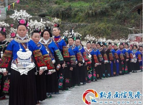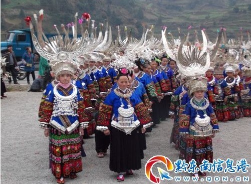 12月7日,筆者到丹江鎮(zhèn)羊排村采訪看到,該村數(shù)百名身著節(jié)日盛裝,頭戴銀光閃閃鳳冠的苗族姑娘匯集蘆笙場,歡跳原生態(tài)蘆笙舞蹈。在歡跳蘆笙的行列中,盛裝在前,便裝在后;盛裝行列中,頭戴銀冠并插銀角在前,只戴銀冠沒有銀角的在后。各色隊伍中,皆是高者在前,矮者在后,層次分明。圍著蘆笙聲的節(jié)拍,跳起古老原生態(tài)的舞蹈,人們叫做“跳蘆笙、踩銅鼓”,苗語稱之為“重趕、重略”。蘆笙場上用的“百家糯米酒”都用牛角盛滿后用來敬親人,稱是敬“牛角酒”。這一古老而又風情濃郁的民族民間活動,使節(jié)日增添了樂趣。