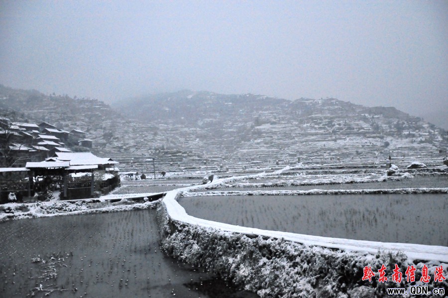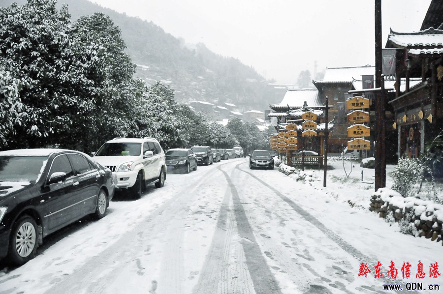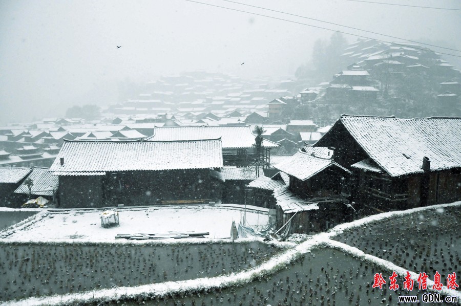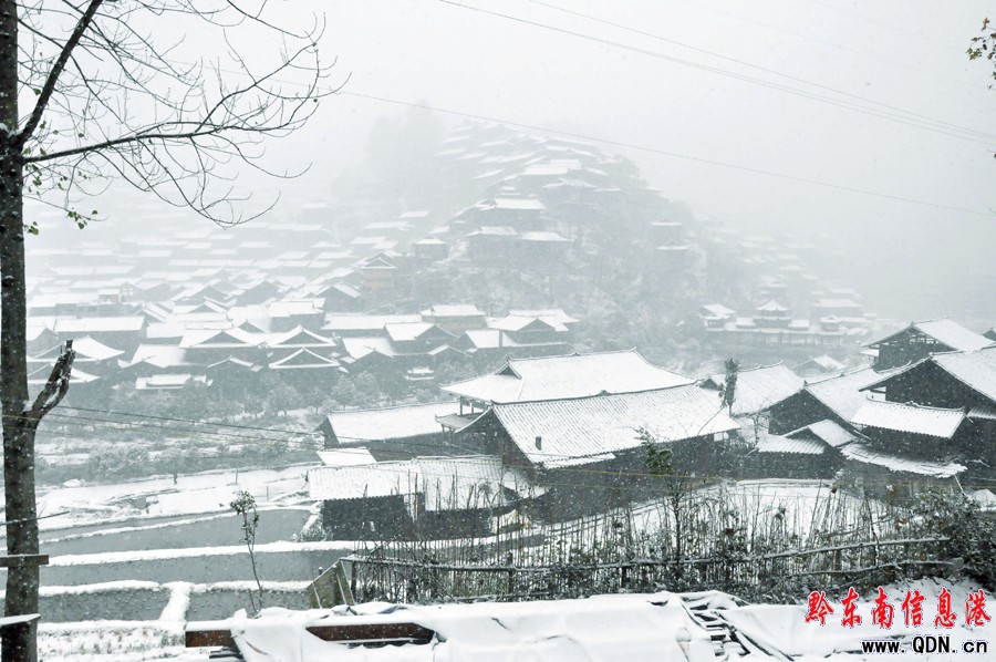 1月4日,西江千戶苗寨上空飄下皚皚大雪,給苗寨憎添了一道迷人靚麗的景色。當日下午的西江,銀裝素裹。整個苗寨蓋上了一層厚厚的積雪,宛如怕冷的它,戴上了一頂白氈帽。游客們感受著西江這一片白茫茫的圖景,大發玩興,紛紛駐足合影留念。(張鴻)