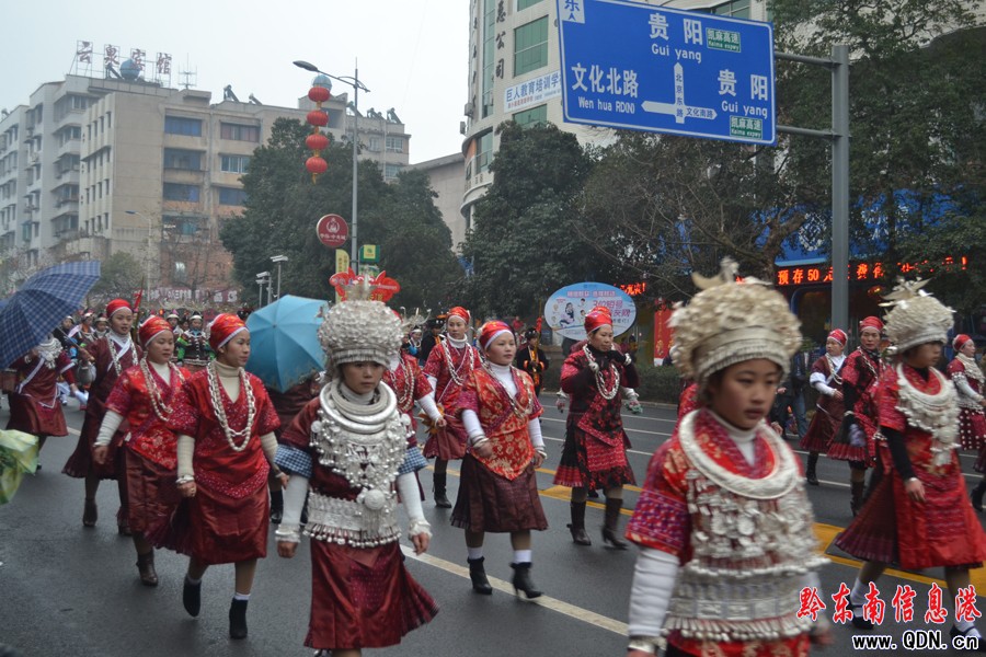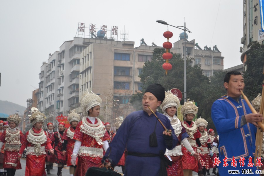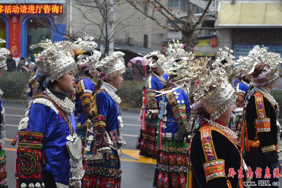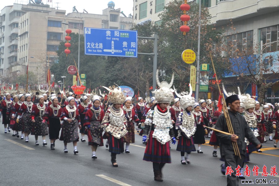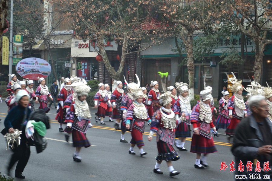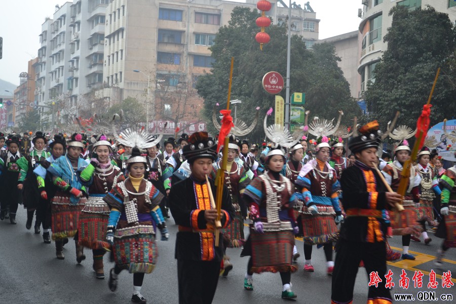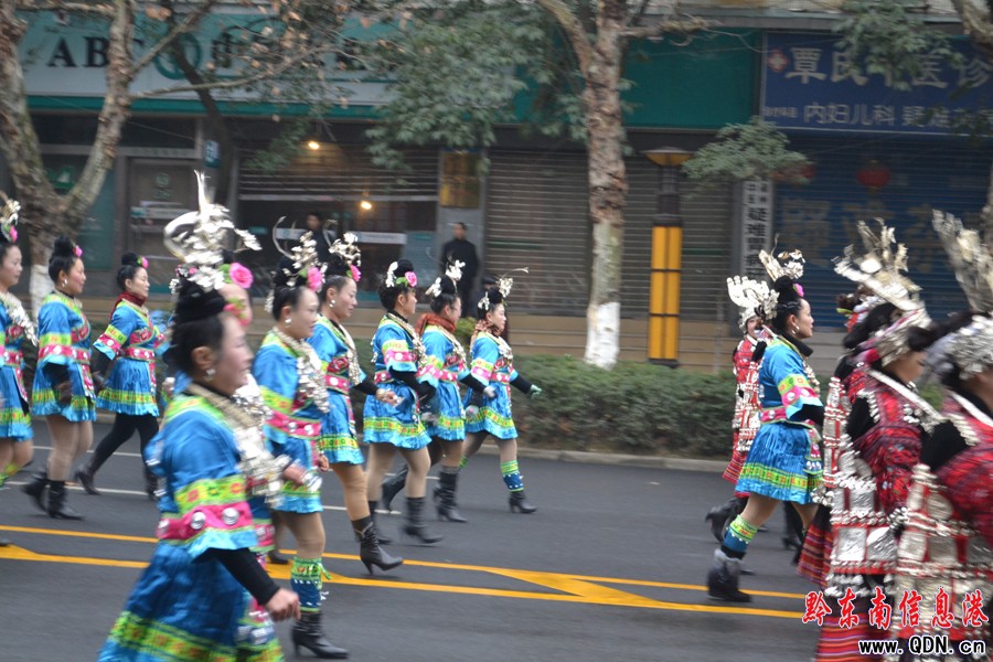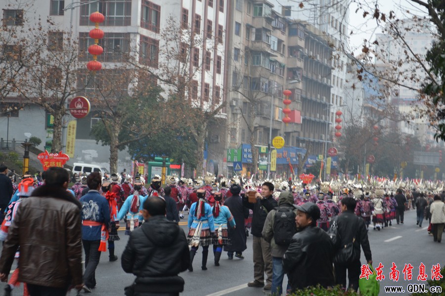 2月9日上午,2012中國凱里•甘囊香國際蘆笙節舉行民族風情盛裝游演。(文筱晟)