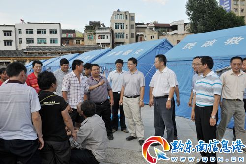 國家減災委辦公室副主任、民政部國家減災中心副主任范一大(右四),省民政廳副廳長劉忠平(右二)一行,在州、市相關單位領導的陪同下,到舟溪蘆笙堂災民避難場所看望災民。