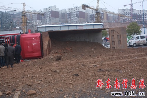 據了解,貨車側翻事故是由于該車剎車失靈,加之雨雪凝凍天氣路面濕滑車輛轉彎時失控導致。(蔣偉)