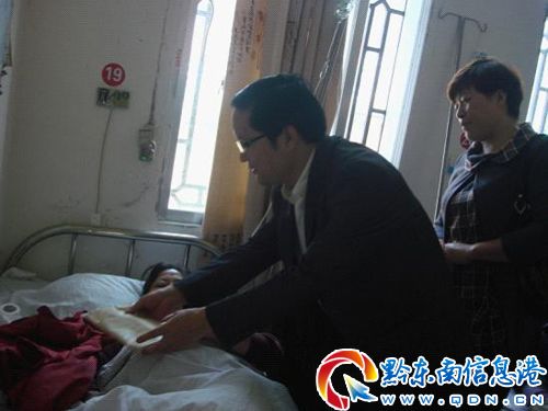 4月23日,從江縣財政局局長王躍邦同局班子全體成員,帶著財政局和全體干部職工捐助款12000元,到該縣中醫院看望身患絕癥的遺屬詹承芳。