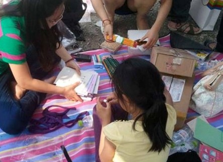 車友們在整理募捐到的學習用品