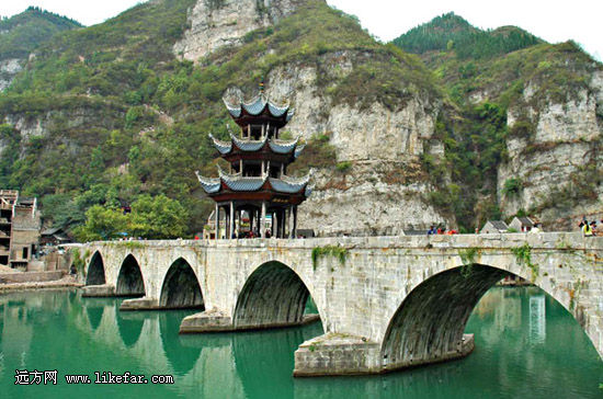 為七孔青石拱橋。橋中央有一個(gè)三層三檐八角攢尖頂樓閣建筑,被稱(chēng)為"狀元樓"、"魁星閣"。據(jù)說(shuō)此樓建成十年后,貴州果然破天荒地出了兩個(gè)狀元。
