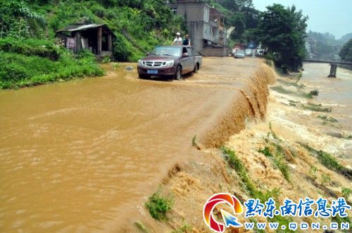 于是,記者改道走丹寨縣方向,但還未離開舟溪集鎮(zhèn)范圍就遇到了“攔路水”(如圖),又被迫返回。原來,一個(gè)建在溶洞中的倪魚養(yǎng)殖基地發(fā)水,大水漫過公路,淹沒了約40米長(zhǎng)的路段,后進(jìn)入舟溪河中,形成了瀑布奇觀。