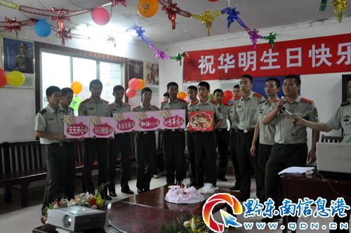 21日晚上,戰友們就為華明的生日作了準備,大家分別去訂做蛋糕、買彩球、鮮花,制作祝福紙板和調試視頻會議室的視頻效果,以保證讓華明能清晰看到戰友們為他祝賀生日的情景。到21日晚上10時許,戰友們把視頻會議扮成了溫馨的小天地。