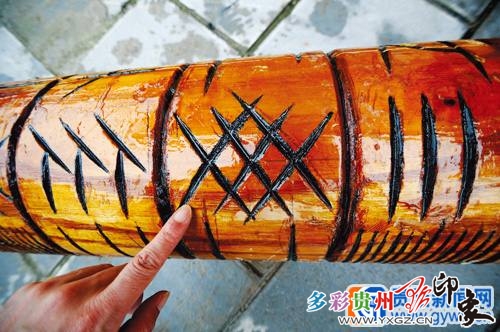 “歌棒”一般一尺多長,但其長短粗細方圓無嚴格限定,微型的“歌棒”可以放在口袋中,而在黃平縣黃飄鄉(xiāng)蒙加村,有戶人家還制作了一根3米長的超大“歌棒”。