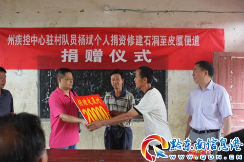6月26日上午,黔東南州疾控中心聯(lián)鄉(xiāng)駐村干部楊斌將個(gè)人捐資2萬元,親手交給天柱縣石洞鎮(zhèn)皮廈村村委,支持該村為山里娃娃修建上學(xué)路,山里娃有了“金榜”路,一寨父老和他歡快一堂。