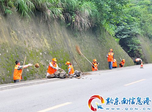 6月27日,凱里公路管理局基層一線職工正在省道308線288公里樁的公路兩側清理水溝淤泥、雜物,疏通涵洞橋,防止暴雨沖毀公路,為省道暢通保駕護航。