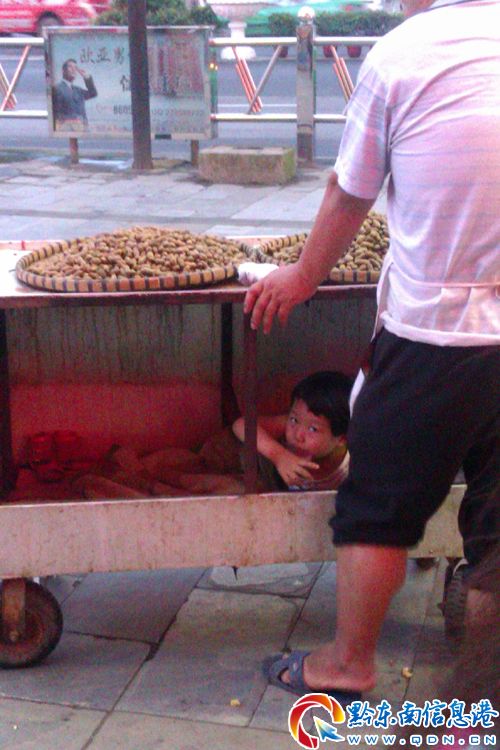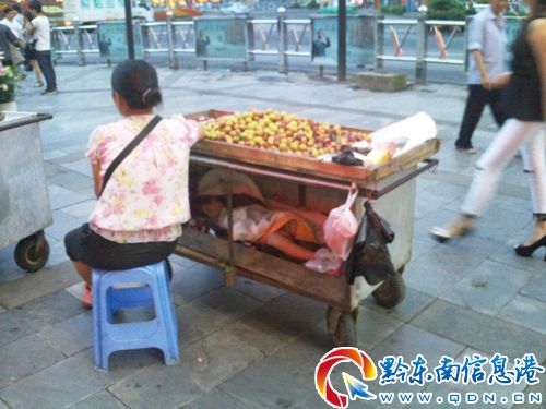 昨日傍晚時分,筆者下班回家路過凱里市大十字郵政大樓地段前,在經過兩個移動的小水果攤時,本想上前購買一點水果吃,不料被攤位下在蠕動物體嚇了一跳。定睛一看,原來是攤主的小孩在攤位下睡覺,想必是被近兩日雨后極速變化的天氣悶到了,想爬出來,模樣惹人憐愛。