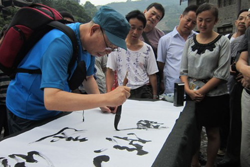 圖為中國音樂家協會理事、中國音樂文學學會常務副主席、中國音協流行音樂協會副主席宋小明先生在鎮遠大河關碼頭為當地政府提詞的情景。