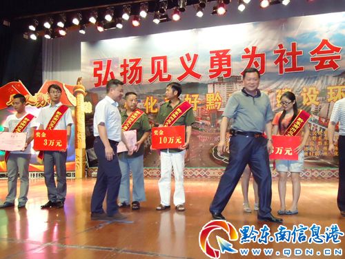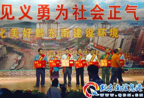 8月2日,黔東南州見義勇為先進人物表彰大會在凱里召開。會議對2011年在黔東南州維護社會治安、社會穩(wěn)定以及搶險救災、救死扶傷中涌現(xiàn)出來的19位見義勇為先進個人和集體分別追授、授予榮譽稱號,并頒發(fā)“黔東南州見義勇為先進人物”榮譽證書及獎勵金。