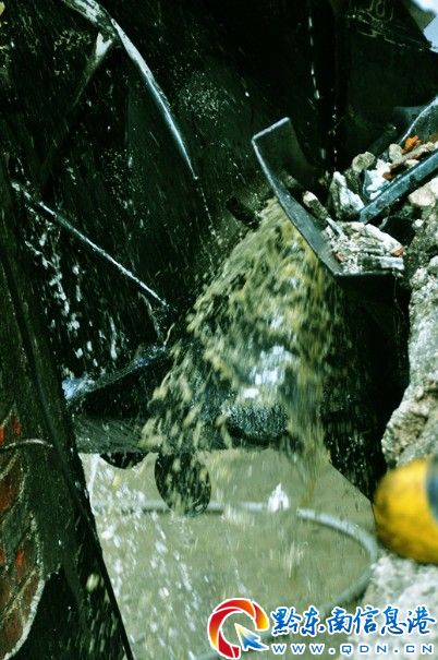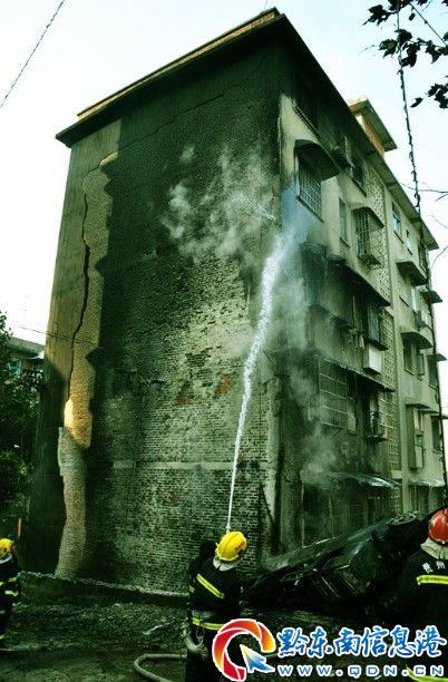 隨后,記者離開院壩,穿越一建筑工地來到院壩上方的地面上,這里是一條具有一定坡度,路面崎嶇不平的道路,往南是建筑工地,往北面就是州建小區。記者在此處看到,油罐車側翻在道路邊緣,尾部抵住樓房,變成了“光架架”的車頭壓在路面上,車底盤已被燒焦,一只前輪只留下了鋼圈。而在車的尾部,大量柴油“嘩嘩”流淌,因無法阻止,消防官兵便朝這些柴油噴水,對其進行稀釋。此外,油罐車抵住的樓房的墻面也被燒焦了,外墻大量脫落,露出了磚塊。當地居民擔心這樓房已變成危房,但這需要權威部門鑒定。