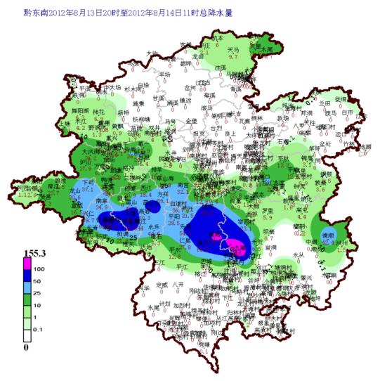 據氣象監測顯示,8月13日20時~8月14日11時黎平九潮155.3mm、榕江寨篙104.8mm降大暴雨,8站暴雨,20站大雨,41站中雨(見下圖)。暴雨和大暴雨分布在黎平、榕江、雷山、丹寨。九潮、寨蒿強降水主要集中在14日8時至10時,預計今天白天州中南部個別鄉鎮暴雨,需特別防范滑坡、塌方等災害。(楊紹洪)