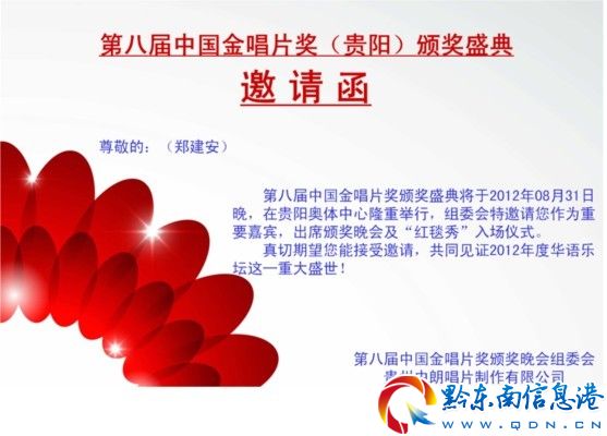 第八屆中國金唱片獎(jiǎng)?lì)C獎(jiǎng)盛典8月31日將在貴陽奧體中心舉行,鄭建安老師受邀出席華語樂壇的盛宴!