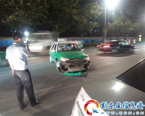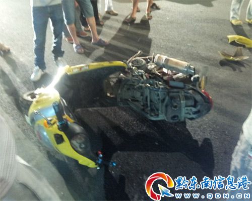 昨晚十二時左右,在北京東路清江崗亭段公交車站臺前,一輛的士車違規掉頭撞上后面開來的一輛黃色摩托車。隨后該摩托車又撞上停在前面的一輛的士車的后保險杠,導致摩托車當場損毀,汽油撒了一地,整個現場彌漫著汽油的味道。