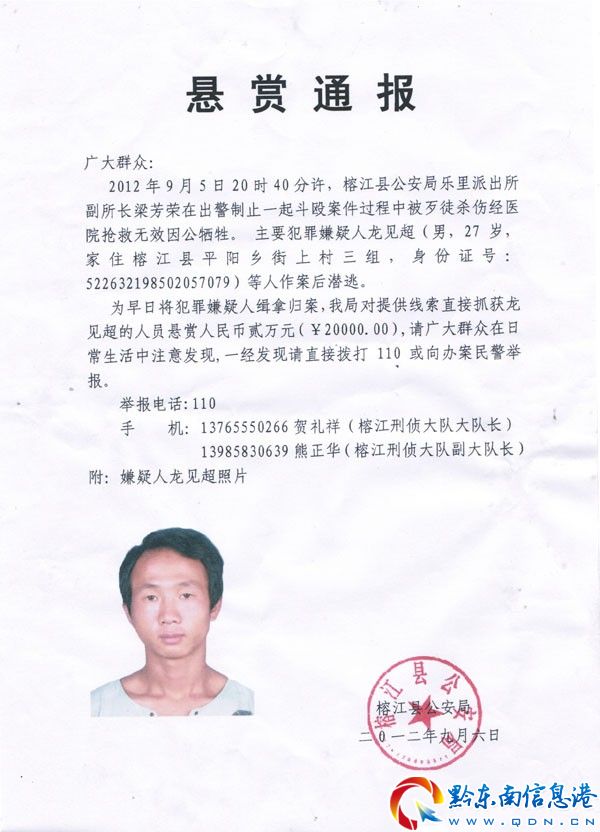 此案發(fā)生后,在榕江引起了極大地震動(dòng),縣委、縣政府以及縣公安局高度重視,迅速?gòu)目h醫(yī)院選派精干力量趕赴樂里鎮(zhèn),全力搶救梁芳榮。但因梁芳榮受傷嚴(yán)重?fù)尵葻o效于事發(fā)當(dāng)日22時(shí)40分犧牲。 據(jù)了解,今年38歲的梁芳榮家住榕江縣樂里鎮(zhèn),1995畢業(yè)于貴州省人民警察學(xué)校,曾任榕江縣公安局朗洞鎮(zhèn)派出所民警、兩汪鄉(xiāng)派出民警、兩汪鄉(xiāng)派出所副所長(zhǎng)、現(xiàn)任榕江縣樂里派出所副所長(zhǎng)(主持工作),科員。 在搶救梁芳榮的同時(shí),黔東南州以及榕江縣警方立即成立了“專案組”,對(duì)案件展開偵破。目前,專案組已將嫌犯楊某某(男,28歲,榕江縣車江鄉(xiāng)三村人)、伍某某(男,38歲,榕江縣平陽鄉(xiāng)人)、楊某某(男,24歲,榕江縣樂里鎮(zhèn)三聯(lián)村人)抓獲。 持刀殺害梁芳榮的嫌犯龍見超(男,27歲,榕江縣平陽鄉(xiāng)街上村人)在案發(fā)后趁亂逃走。警方為及早將其抓獲,以告慰英靈,于9月6日發(fā)布通告,懸賞兩萬元人民幣緝拿。警方希望請(qǐng)廣大群眾一經(jīng)發(fā)現(xiàn)龍見超的行蹤及相關(guān)線索,即撥打110或向辦案民警舉報(bào)。舉報(bào)電話:110;手機(jī):13765550266賀禮祥(榕江刑警大隊(duì)大隊(duì)長(zhǎng));13985830639熊正華(榕江刑警大隊(duì)副大隊(duì)長(zhǎng))。(羅茜)