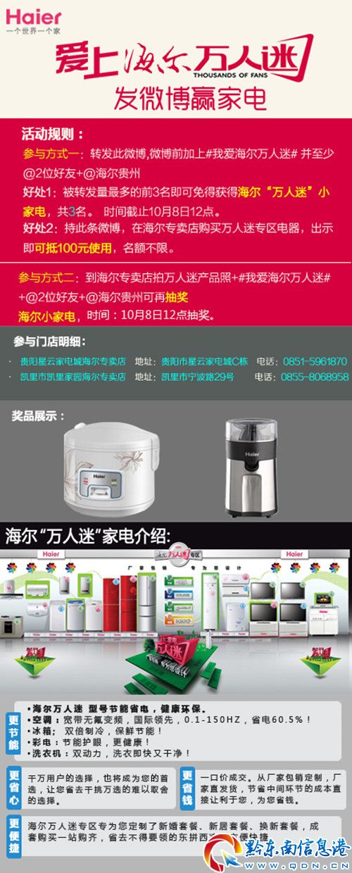 采訪中記者還獲知,針對海爾“萬人迷”系列產品,一場名為“愛上海爾萬人迷”的微博活動也在緊鑼密鼓的進行當中,http://e.weibo.com/ligr1009/profile?type=0消費者參與活動后不單有機會獲得海爾小家電獎品,更可憑借微博享受百元優(yōu)惠,相信像小張、小李這樣的新婚夫婦,將會從中獲得更大的意外驚喜。
