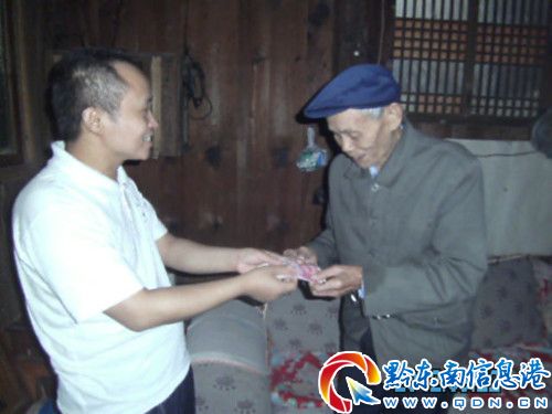 活動當(dāng)天,岑鞏志愿者受貴州省和全國關(guān)愛抗戰(zhàn)老兵組織的委托,冒雨來到該縣思陽鎮(zhèn)桐木村地英自然寨抗戰(zhàn)老兵劉榮光家,給老英雄送上了慰問金。