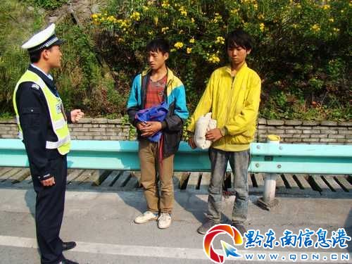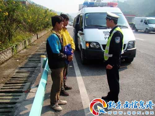 據介紹,2012年9月19日上午9時許,黔東南州高速公路交警大隊三中隊民警黎建州等駕車巡邏至滬昆高速公路下行線劍河溫泉服務區附近時,發現兩名少年在超車道上緩慢行走,不時有車輛從他們身邊呼嘯而過,極易發生交通事故。