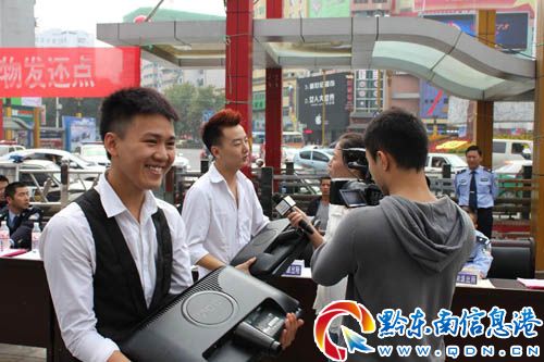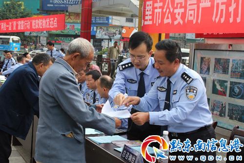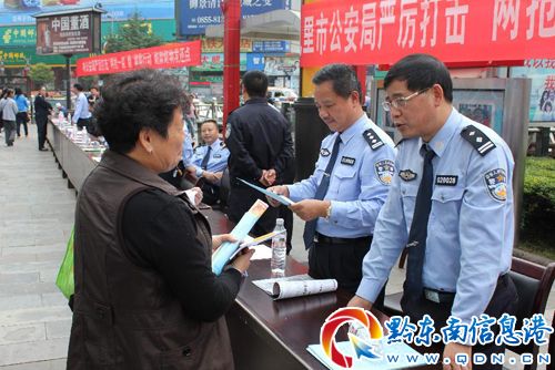 宣傳活動中,州公安局副局長、市公安局局長楊天權(quán)同志率領(lǐng)市公安局黨委成員和各警種負責(zé)人主動向過往的市民發(fā)放治安防范宣傳資料、解答群眾的咨詢。通過兩輛宣傳車在全市主要街道播報《凱里市人民政府在全市范圍內(nèi)開展嚴(yán)厲打擊“兩搶一盜”等違法犯罪專項行動的通告》、《凱里市公安局告全市人民群眾的一封公開信》等宣傳內(nèi)容。并舉行了贓物發(fā)還儀式。