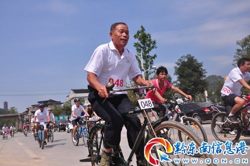 這位白發老人名叫楊家堂,今年66歲了,他是天柱縣郵政局的退休職工,也是這次參賽年紀最大的選手。曾是全國特等郵電勞模。他說,記得上世紀八十年代,天柱舉行自行車40公里越野賽,當時只用了1個小時,還得了第一名。他還參加黔東南州80公里自行車越野賽,得過第三名。“現在年紀大了,只想帶個頭,重在參與。”他樂呵呵地說。