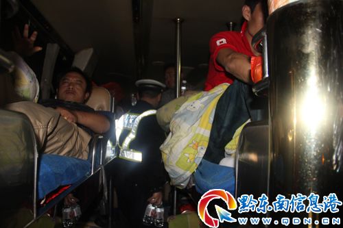 2012年10月5日0時許,黔東南高速交警大隊二中隊民警接高速交警大隊指令稱在滬昆高速上行線1730KM+400M處有一輛大客車因發(fā)動機故障停駛于應急停車道上,急需出警救助。接警后,中隊民警立刻趕往事發(fā)現(xiàn)場。經(jīng)查:一輛湖南邵東至云南昆明的大型臥鋪客車滿載39名乘客因車輛故障停駛在應急車道內(nèi),停車處位于急彎下坡路段,加之正處“兩節(jié)”期間,車流量大,此時又出現(xiàn)雨霧,夜間視線模糊,若發(fā)生事故,后果將不堪設(shè)想。鑒于此,二中隊立即安排民警到入彎前150米處,放置好反光錐筒做好現(xiàn)場防護措施,利用勘查燈具警示過往車輛減速行駛。