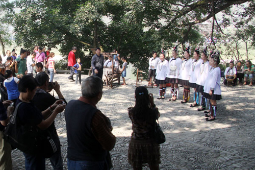 被譽(yù)為“天下第一侗寨”的榕江縣三寶侗寨,是國(guó)家級(jí)風(fēng)景名勝區(qū)榕江苗山侗水風(fēng)景名勝區(qū)的核心區(qū)。隨著廈蓉高速公路的修通,到榕江旅游的人數(shù)越來(lái)越多,2011年,榕江縣共接待游客62萬(wàn)余人。為提升三寶侗寨知名度,吸引更多游客到這里旅游,國(guó)慶黃金周期間,榕江縣景區(qū)管理部門(mén)在三寶侗寨景區(qū)推出文化套餐,組織侗族青年免費(fèi)向游客演唱侗族大歌、侗族琵琶歌,展示侗族紡紗織布,還與游客互動(dòng),邀請(qǐng)游客一起歡跳侗族“多耶”舞,讓游客體驗(yàn)侗鄉(xiāng)的歡樂(lè)。
