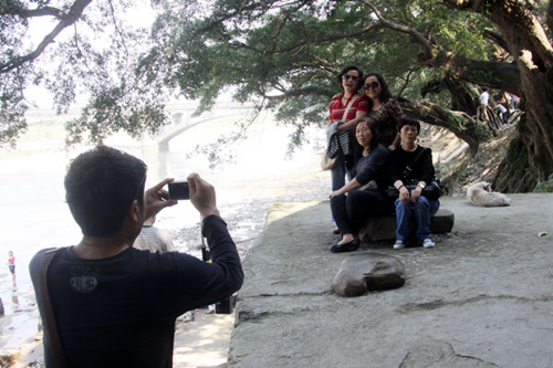 游客在古榕樹下留影。(楊成利 攝)