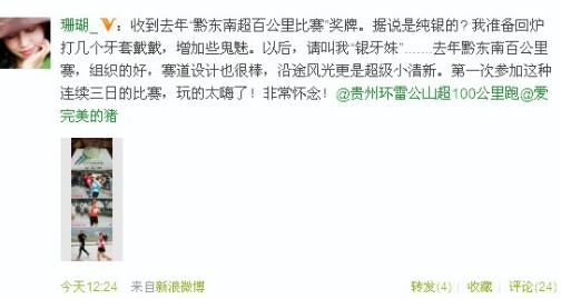 去年參加“2011中國•貴州黔東南超100公里跑國際挑戰賽”選手均獲得由黔東南苗侗純收工銀飾傳承人精心打造的獨具苗侗元素的銀質紀念獎牌等紀念品,“珊瑚”在微博曬出:“收到去年“黔東南超百公里比賽”獎牌,據說是純銀的?我準備回爐打幾個牙套戴戴…”。(文筱晟)