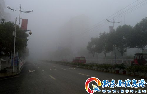 丹寨縣城龍泉大道,濃霧籠罩全城