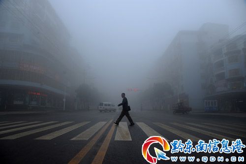 丹寨縣城龍泉大道,一名市民在濃霧中行走