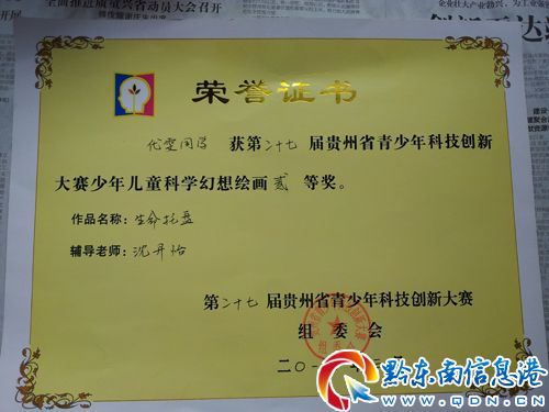 在由施秉縣科協、教育局、環保局、文體廣電旅游局、團縣委、婦聯共同舉辦的第七屆全縣青少年科技創新大賽組委會推薦參加貴州省第二十七屆青少年科技創新大賽中,施秉縣楊柳塘中心小學沈丹怡老師輔導該校學生楊雯同學創作的青少年兒童科學幻想繪畫作品——《生命的托盤》榮獲二等獎。該作品同時榮獲黔東南州第十屆青少年科技創新大賽二等獎,施秉城關二小楊敏老師輔導的青少年兒童科學幻想繪畫作品《未來云層雨轉換器》和《溫泉水回收利用裝置》榮獲三等獎。(施秉縣教育局 王世才)